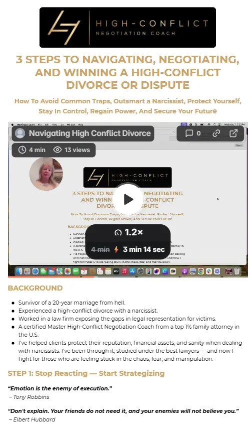 Get Instant Free Access To A Video Training And Canva Doc Where I Show And Guide You Step-By-Step How To Avoid Common Traps, Outsmart a Narcissist, Protect Yourself, Stay In Control, Regain Power, And Secure Your Future So That You Can Win Your Battle, Save Your Finances, And Rebuild Your Life.
